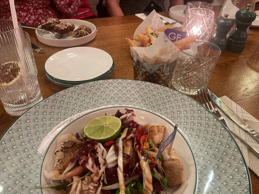 When I got there I met with Caitlin who got their early, I got myself Espresso Martini (vanilla vodka, Kahlúa coffee liqueur and cold brew coffee). I got myself a Peach & Elderflower Spritz (peach & elderflower liqueur, topped with soda and Italian sparkling wine) with my dinner in which I chose the gluten free Asian Chicken Salad (roast chicken breast, pak choi, pickled ginger, shredded leaves with a soy & sesame dressing) which was delicious and a side of gluten free Truffle & Parmesan Fries. Followed by a Raspberry & Vanilla Martini (Mount Gay Rum, Montzi botanical spirit, raspberry, vanilla and cranberry juice).