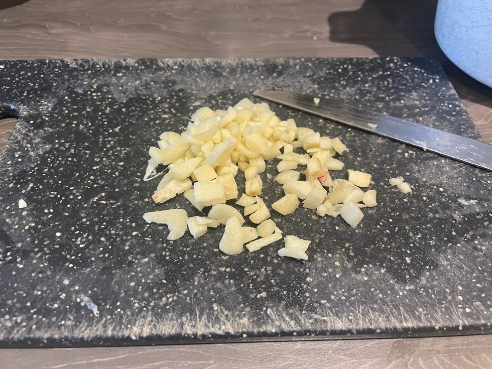 Step 4: I place the knife flat on the cloves individually and hit it, this crushes the garlic slightly, I peel all of the garlic and cut it into small chunks.