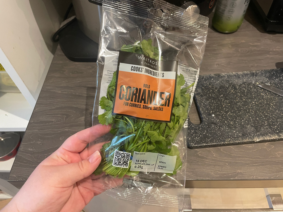 Step 5: I roughly cut up the coriander and add this to the jug, all of the coriander.