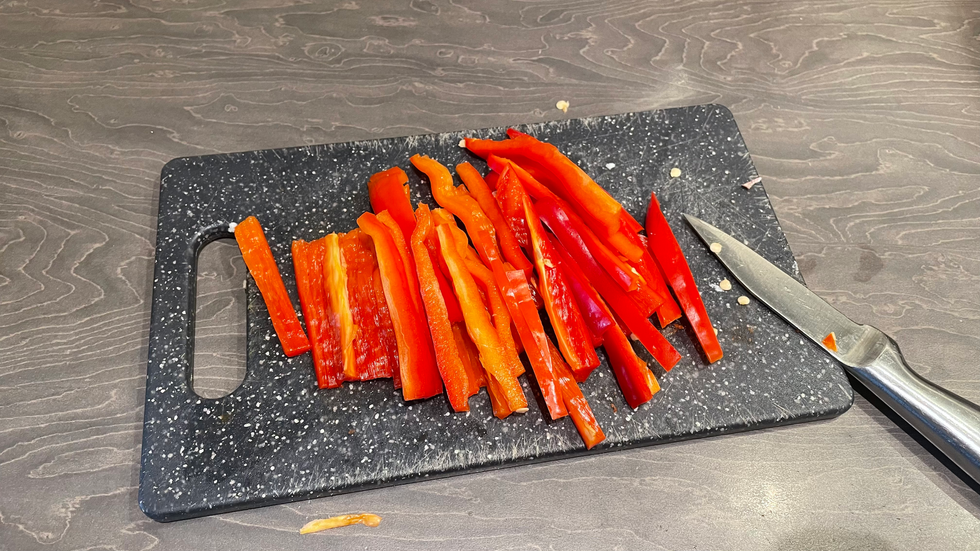 STEP 4: Deseed the pepper (scrape the seeds and pith out with a teaspoon) and cut into thin strips. Slice the red chilli finely (can't handle the heat? Take the seeds out!)