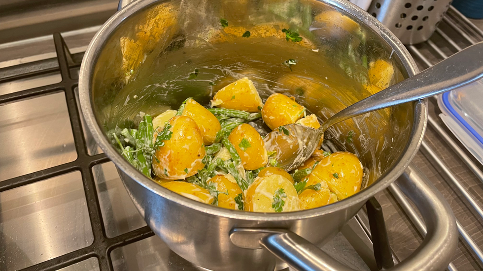STEP 1: Boil a kettle. Cut the waxy potatoes in half.