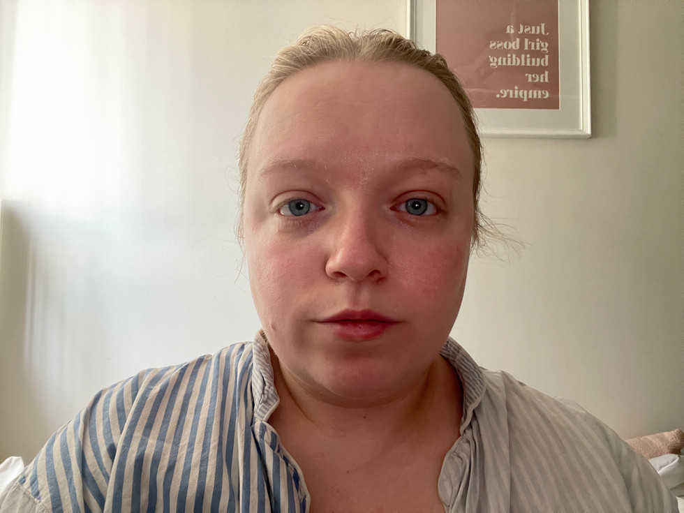Makeup all done, it is smoother on the side with foundation but still looks dry and matte.