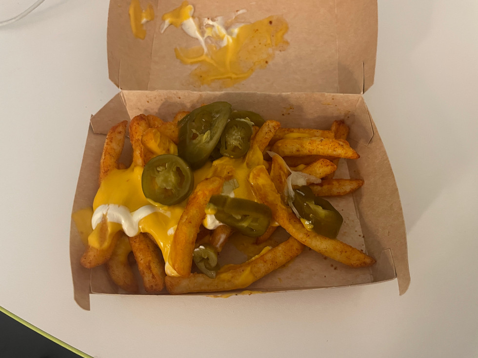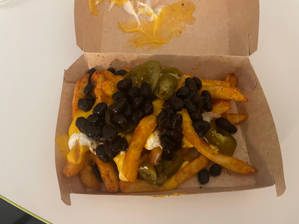 I ordered the cheesy topped fries which is fries, nacho cheese sauce and sour cream.