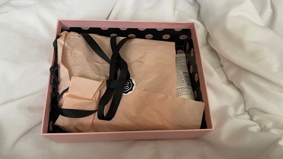 The cute postage box with the perfect tear off strip to open the box to reveal the cute themed box which has tissue paper, shredded tissue and a cute ribbon. It wasn't very neatly done this month.