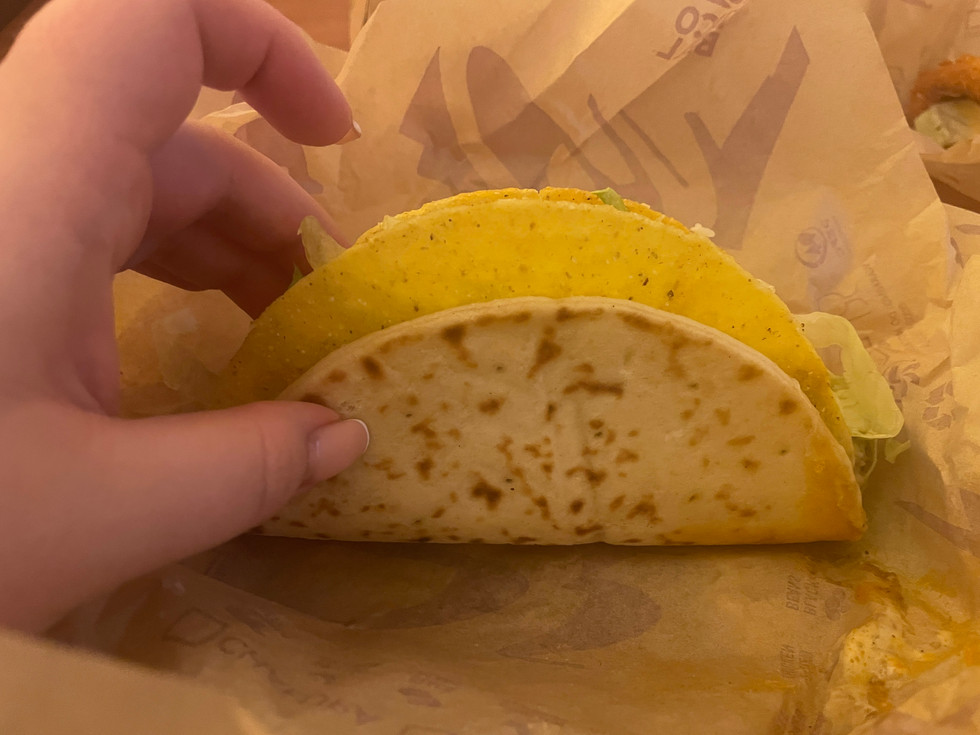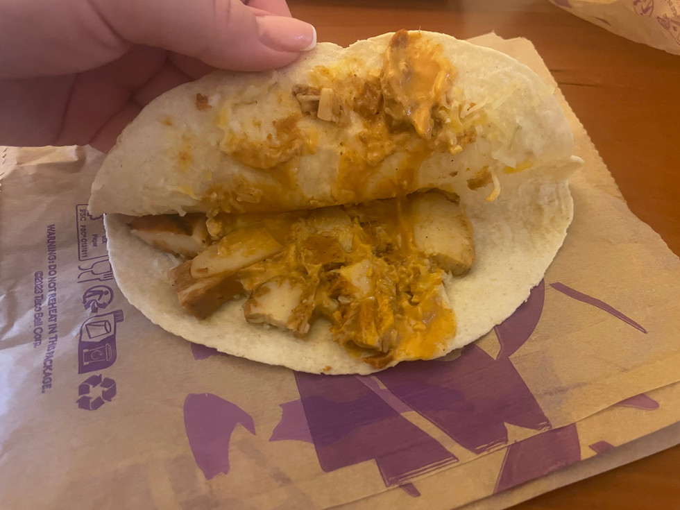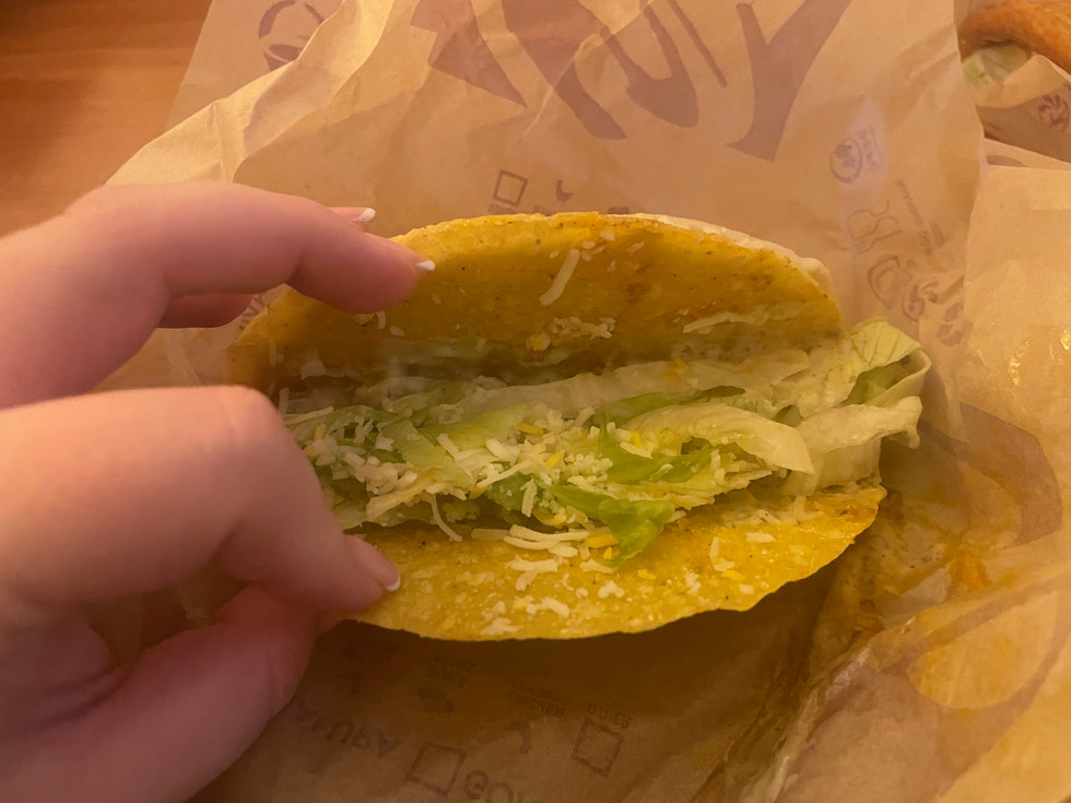 Dinner: Taco Bell feast (SOFT TACO SUPREME (beef, crisp lettuce, cool sour cream, diced tomatoes and cheddar cheese in a soft flour tortilla - forgot to get the tomatoes removed), CRUNCHY TACO SUPREME (beef, crisp lettuce, cool sour cream, diced tomatoes and cheddar cheese in a crunchy corn taco shell - removed the tomatoes), NAKED CHICKEN TACO (crispy chicken shell filled with crispy lettuce, diced tomatoes, 3 cheese blend and the choice of Cali Ranch Sauce (Mild) or Lava Sauce (Wild) - removed the tomatoes and went for Lava Sauce), BABY QUESADILLA (grilled chicken, creamy jalapeño style sauce and three blend melted cheese inside a small flour tortilla), CHEESY GORDITA CRUNCH (pillowy flatbread covered in melted cheese and wrapped around a crunchy taco shell filled with seasoned beef, crisp lettuce, cheddar cheese and Cali ranch sauce) and CHEESY TOPPED LARGE FRIES (large portion of seasoned fries topped with extra warm nacho cheese sauce and cool sour cream)).