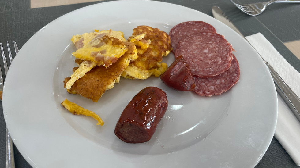 Breakfast: Turkish sausage, readymade bacon omelette and salami plus a chocolate and vanilla muffin with a glass of orange and a cup of coffee Snack: iced coffee as well as a few Tequila Sunrises Lunch: gyros Snack: more Tequila Sunrises Dinner: Chicken Caesar salad and pappardelle carbonara