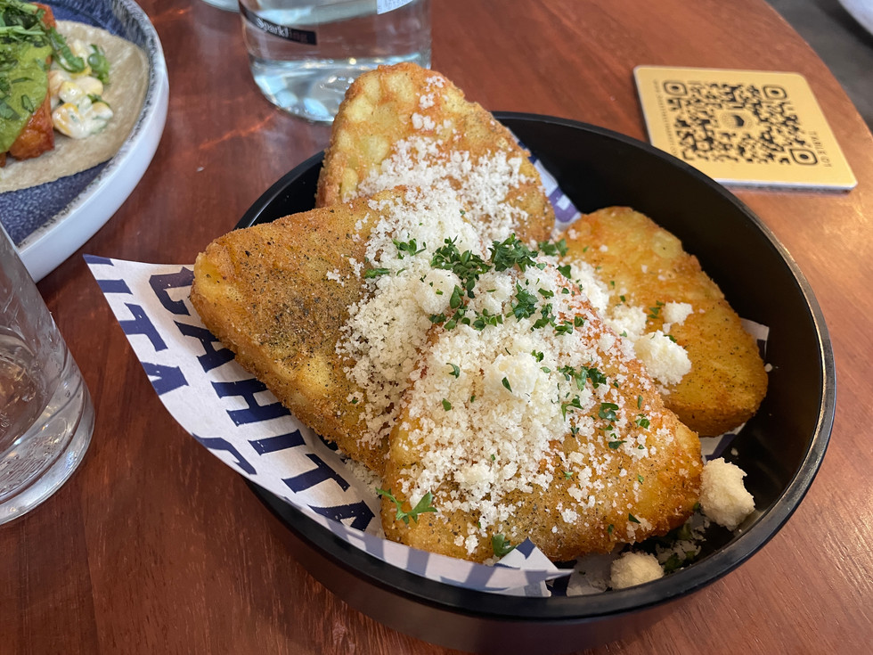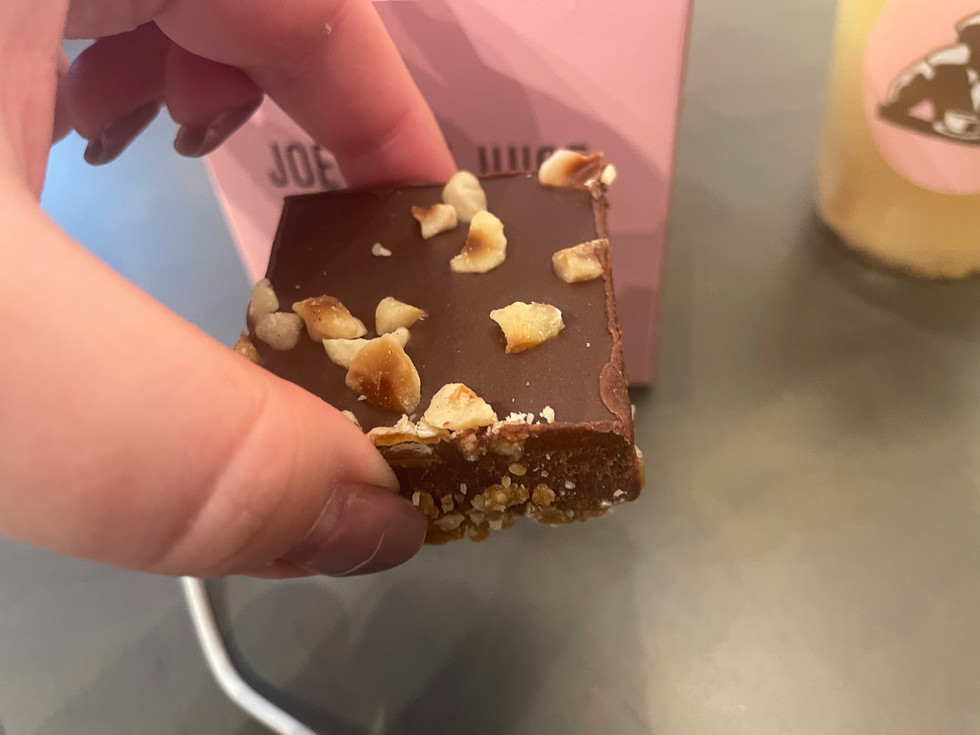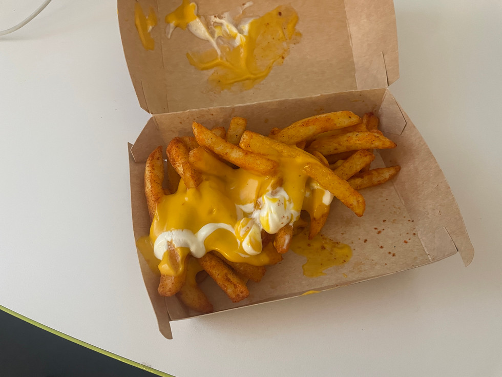 Breakfast: Joe & The Juice cappuccino and Eggcado (Breakfast Bread, Egg Salad, Avocado, Spinach, Serrano ham and Tabasco) Snack: Joe & The Juice Sports Juice (Apple, Passion Fruit, Pineapple, Olive Oil, Ice) and raw hazelnut square Lunch: Duke Street Food & Drink Market - sparkling water, halloumi and corn tacos (esquites corn salad, coriander, spring onion & lime), halloumi bites (sticks of Cumbrian halloumi served with homemade chilli sauce), loaded halloumi shawarma chips (chips with Cumbrian halloumi, roast garlic mayo, cucumber, red onion, mint yoghurt & cucumber), chorizo croquetas (croquettes with chorizo, served with aioli), cheesy hash browns. Dinner: Taco Bell cheesy Gordita crunch and a side of cheesy fried with beans and jalapeños