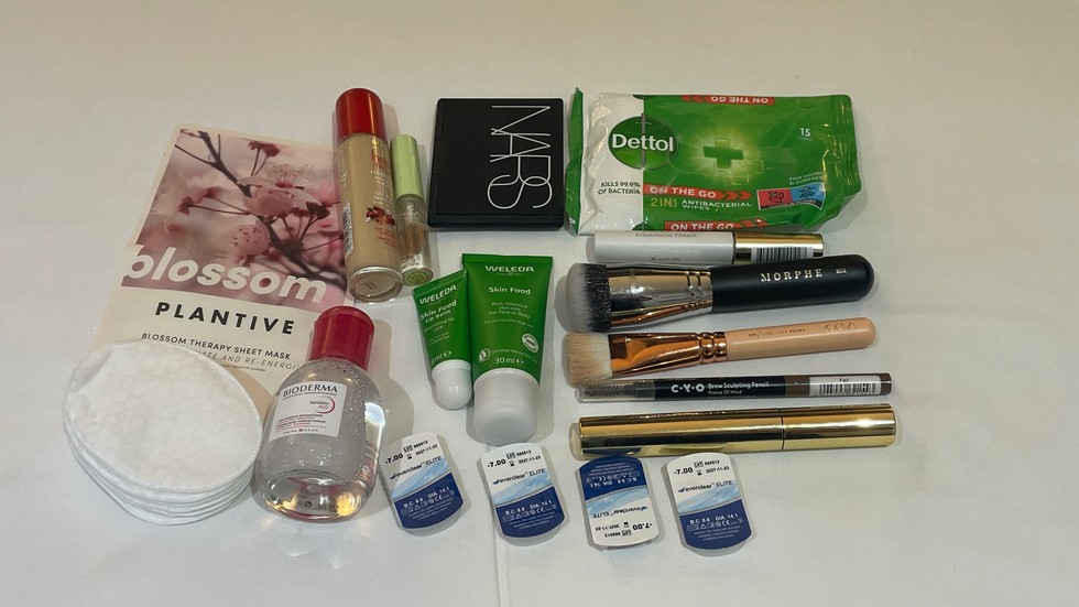 In my clear travel toiletries bag there is PLANTIVE Blossom Sheet Mask (purchase here), Bourjois Healthy Mix Serum Gel Foundation in Light Vanilla, Pixi Brow Gel, NARS Bronzer in Paloma, Dettol wipes, cotton pads, Bioderma micellar water, Weleda Skin Food Lip Balm, Weleda Skin Food Moisturiser, contact lenses, Max Factor Miracle Prep Eyeshadow Primer, Morphe M444, Zoeva 109 Luxe Face Paint, CYO Frame of Mind Brow Sculpting Pencil in Fair and Federico Mahora Makeup Legendary Full HD Lashes Mascara.
