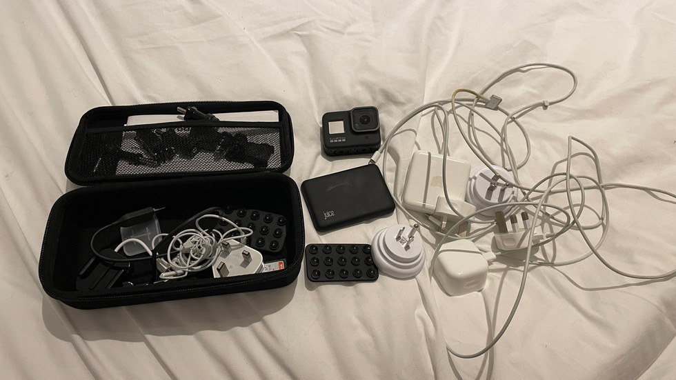 I have a tech section, so in the GoPro box/bag I have the Go Pro, Juice pack and all the chargers I need plus headphones.