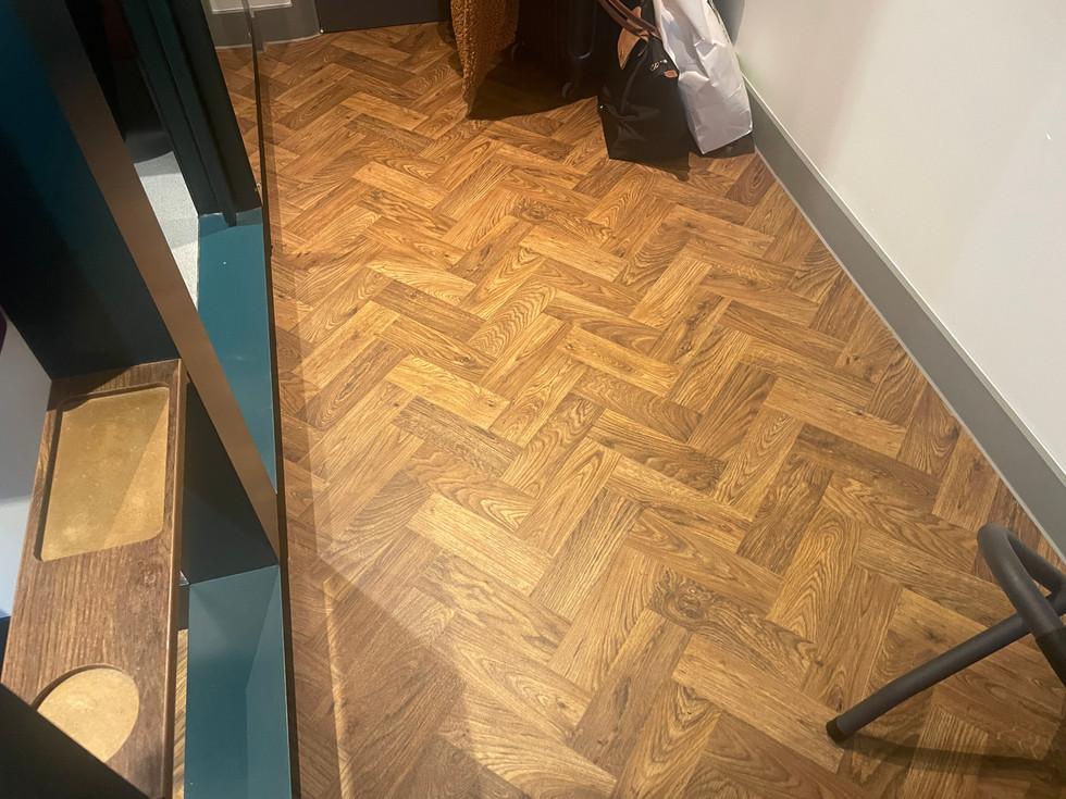 The rooms are industrial chic in a way with the exposed ceilings and metal piping but with gorgeous flooring.